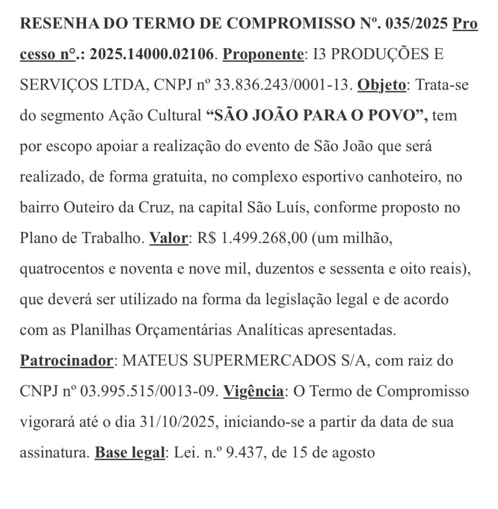 Entre os projetos aprovados estão o “1º Grito de Carnaval: Avenida da Folia”, com custo de R$ 1,84 milhão, o evento “Viva 2025”, realizado em Colinas com R$ 499 mil, e o “São João para o Povo”, em São Luís, que recebeu R$ 1,49 milhão. Todos foram contemplados sob o argumento de “promover acesso gratuito à cultura”, mas os altos valores e a repetição de beneficiários levantam suspeitas sobre um possível favorecimento dentro da pasta.