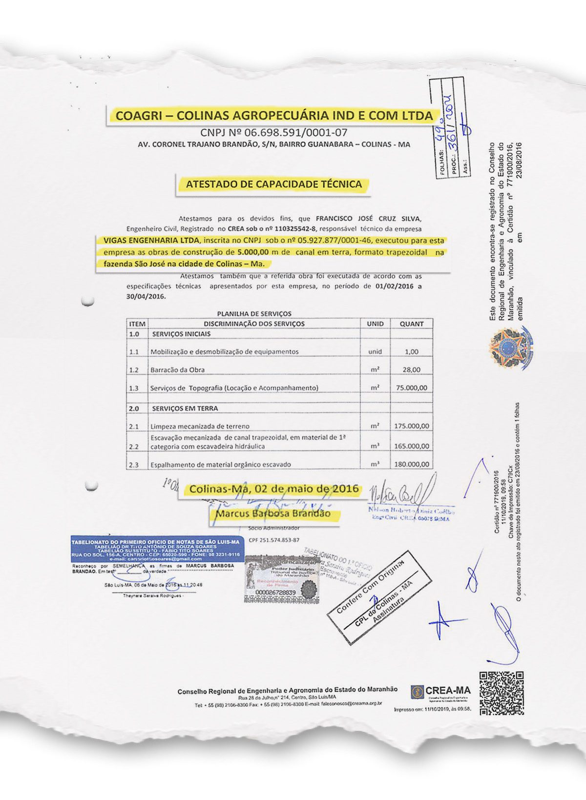 Documentos e registros públicos mostram uma série de conexões entre a Vigas Engenharia e pessoas próximas ao governador. Entre os vínculos apontados estão o uso de e‑mails, telefones e endereços ligados a empresas da família Brandão, além da atuação de parentes e ex-cunhados como representantes ou procuradores da empreiteira. Em uma das evidências, o irmão do governador, Marcus Brandão, aparece assinando documento de atestado técnico em favor da Vigas.