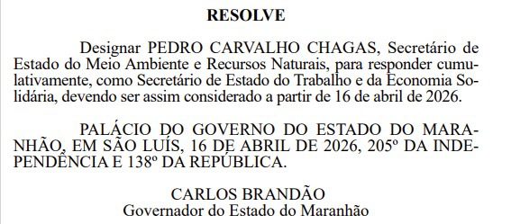 Como consequência, Brandão designou Pedro Carvalho Chagas para acumular funções no governo, assumindo interinamente a Secretaria do Meio Ambiente e também a SETRES a partir de 16 de abril de 2026. A decisão reforça a centralização das pastas e escancara o isolamento do PT na gestão estadual, num cenário que reflete o distanciamento entre o governador e o presidente Luiz Inácio Lula da Silva, indicando que o grupo de Brandão pode seguir sem o CNPJ do PT nas eleições que se aproximam, tendo que enfrentar Lula em outro palanque, veja a nomeação: