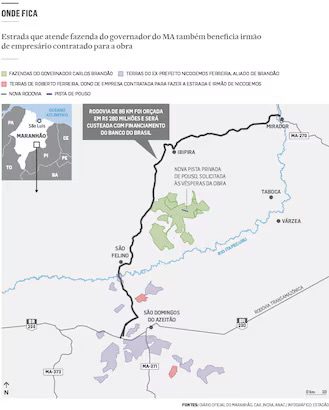 Segundo o Estadão, a reportagem cruzou dados de registros agrários e ambientais e constatou que Nicodemos possui pelo menos 15 mil hectares de terra próximos ao novo traçado da estrada — o equivalente a 21 mil campos de futebol. Já Roberto Ferreira, dono da TAC, é proprietário de mais 870 hectares na mesma região. A denúncia também menciona que a licitação coincidiu com a ampliação dos negócios da família Brandão na área, que até então concentrava seus investimentos em Colinas.