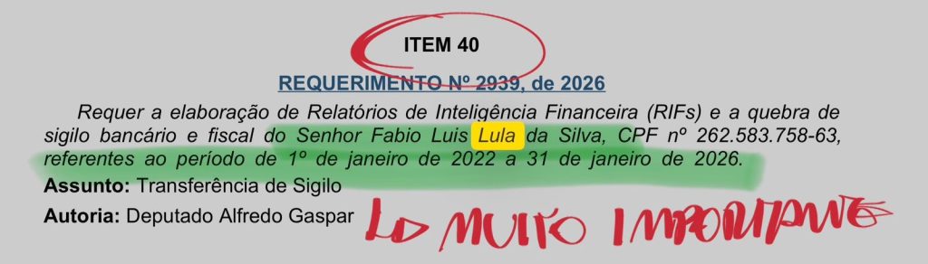 A Comissão Parlamentar de Inquérito (CPI) mista que investiga irregularidades no Instituto Nacional do Seguro Social (INSS) aprovou nesta quinta-feira (26) a quebra de sigilo bancário e fiscal de Fábio Luís Lula da Silva, conhecido como Lulinha, filho do presidente Luiz Inácio Lula da Silva (PT).
