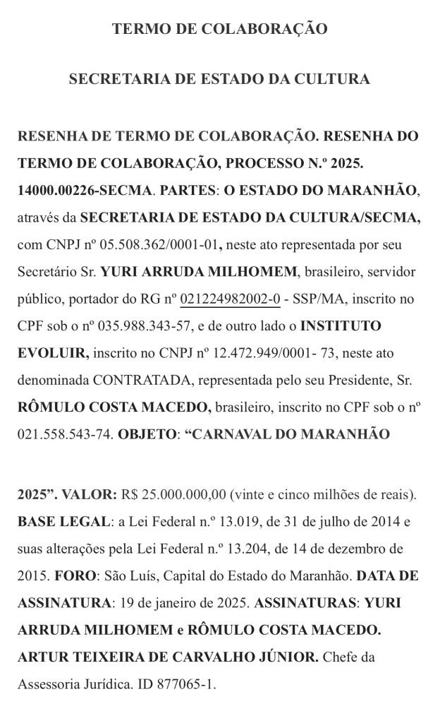 A denúncia feita pelo deputado Rodrigo Lago escancarou o que pode ser um dos maiores escândalos de verbas públicas da Cultura no Brasil. Documentos oficiais revelam que instituições ligadas à Secretaria de Estado da Cultura receberam cifras milionárias para a realização do Carnaval do Maranhão, com valores exorbitantes destinados à contratação de trios elétricos e estruturas de evento.