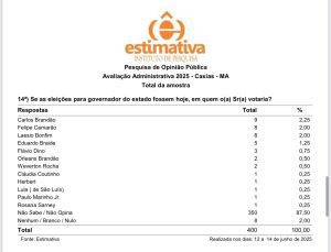 Já o Instituto Estimativa fez uma sondagem espontânea sobre possíveis nomes para a sucessão estadual. Mesmo com 87,50% dos entrevistados afirmando não saber ou preferindo não opinar, Felipe Camarão foi novamente o mais citado entre os nomes apresentados, com 2,00%, empatado tecnicamente com Carlos Brandão e Lahesio Bonfim. Eduardo Braide aparece com 1,25%, seguido por Flávio Dino (0,75%) e outros nomes com menos de 0,50%.