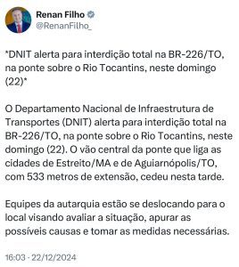 Na tarde deste domingo (22), a Ponte Juscelino Kubitschek de Oliveira, que liga Estreito (MA) a Aguiarnópolis (TO), desabou sobre o Rio Tocantins, causando comoção na região. A estrutura cedeu por volta das 15h, enquanto três caminhões passavam pelo local. Segundo informações da Prefeitura de Estreito, o incidente deixou uma vítima fatal e outras duas pessoas feridas, que foram encaminhadas ao hospital da região.