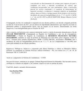 Os advogados de defesa de Biné Figueiredo contestaram as acusações, mas os argumentos não foram aceitos pelo magistrado. Iran Kurban Filho reafirmou que o candidato foi condenado em decisão colegiada em 2017 por ato doloso de improbidade administrativa, o que resultou na suspensão de seus direitos políticos, tornando‑o inelegível para as eleições municipais de 2024, veja parte do indeferimento: