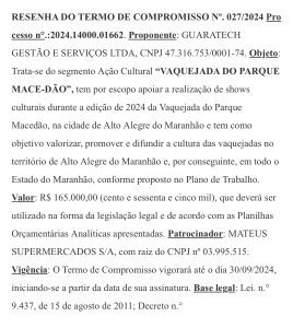 A esposa do “rei da Lei de Incentivo” no Maranhão, Yuri Melo amigo de infância de Orleans Brandão , a médica Muriel Garcia Melo, também atua longe dos consultórios. Ela é empresária e dona da Guaratech Gestão e Serviços LTDA (CNPJ 47.316.753/0001–74), empresa que vem movimentando valores expressivos por meio da Lei de Incentivo. Entre os projetos financiados estão eventos como vaquejadas, festas de vaqueiro e a chamada “Festa do Galo Duro”, esta última captando R$ 500 mil pagos pelo Grupo Mateus, uma das empresas que mais destina recursos a projetos ligados ao casal. Somadas, as cifras ultrapassam facilmente R$ 1 milhão.