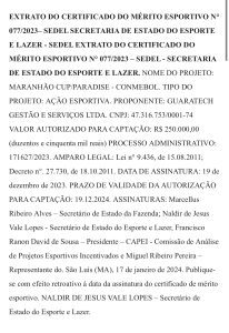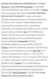 A esposa do “rei da Lei de Incentivo” no Maranhão, Yuri Melo amigo de infância de Orleans Brandão , a médica Muriel Garcia Melo, também atua longe dos consultórios. Ela é empresária e dona da Guaratech Gestão e Serviços LTDA (CNPJ 47.316.753/0001–74), empresa que vem movimentando valores expressivos por meio da Lei de Incentivo. Entre os projetos financiados estão eventos como vaquejadas, festas de vaqueiro e a chamada “Festa do Galo Duro”, esta última captando R$ 500 mil pagos pelo Grupo Mateus, uma das empresas que mais destina recursos a projetos ligados ao casal. Somadas, as cifras ultrapassam facilmente R$ 1 milhão.