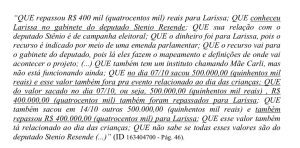 Nos bastidores da Assembleia, ganhou força o boato de que os R$ 400 mil apreendidos seriam destinados à deputada Helena Duailibe, já que a emenda que originou o repasse à Companhia de Cultura Popular Catarina Mina partiu de seu gabinete. A deputada, no entanto, negou veementemente qualquer envolvimento e afirmou que o recurso foi aplicado de forma regular. O episódio, contudo, gerou uma reviravolta política, já que, por conta do parentesco de Larissa com Stênio Rezende, a repercussão acabou respingando sobre a deputada Andrea Rezende, que agora enfrenta forte pressão política e moral dentro e fora da Alema, veja a emenda da deputada EMENDA DA DEPUTADA