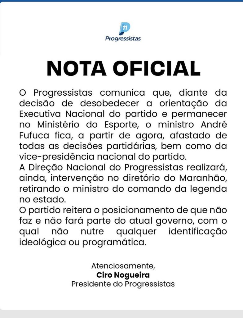 Na nota oficial assinada por Ciro Nogueira, o Progressistas reafirma que “não faz e não fará parte do atual governo, com o qual não nutre qualquer identificação ideológica ou programática”. O documento também formaliza o afastamento de Fufuca e a intervenção no diretório estadual maranhense, marcando um novo capítulo da crise interna entre a ala governista e a cúpula oposicionista da legenda, veja a nota :