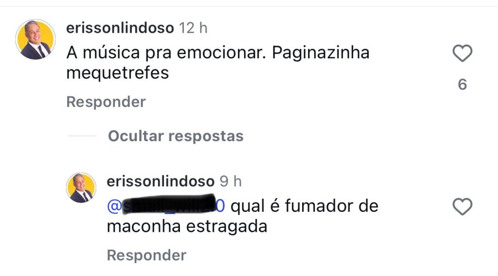 Incomodado com a repercussão da publicação, o presidente do conselho passou a desqualificar a página, chamando‑a de “mequetrefe”, e avançou ainda mais ao insinuar que pessoas que discordavam de sua opinião fariam uso de drogas. Em um comentário público, Erisson questionou um internauta com a frase: “qual é, fumador de maconha estragada”, atribuindo a uma pessoa desconhecida o uso de entorpecentes simplesmente por expressar uma opinião contrária à sua. A postura é ainda mais grave por partir justamente de quem preside um conselho voltado à formulação e acompanhamento de políticas sobre drogas no estado, veja :