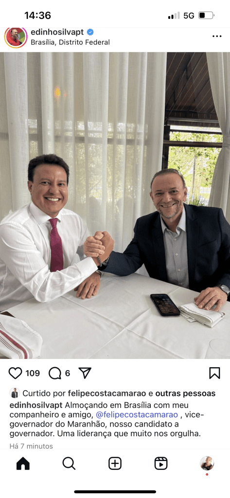 Na postagem, Edinho afirma: “Almoçando em Brasília com meu companheiro e amigo, @felipecamarao, vice-governador do Maranhão, nosso candidato a governador. Uma liderança que muito nos orgulha.” O recado foi claro e certeiro: o PT já escolheu seu nome para a disputa, fortalecendo a pré-campanha de Camarão, que segue como uma peça estratégica no projeto político que une Lula, Brandão e setores da esquerda maranhense , veja a postagem do presidente do PT em uma rede social :