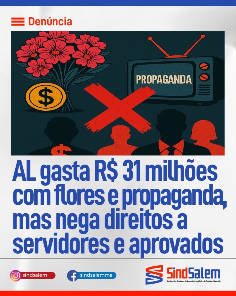 Enquanto ignora direitos básicos dos servidores e deixa concursados do cadastro de reserva esquecidos, a Assembleia Legislativa do Maranhão (ALEMA) caminha para gastar mais de R$ 31 milhões em publicidade e arranjos florais. Só em 2024 e 2025, estão previstos R$ 6 milhões com mídias sociais, R$ 11,9 milhões com a Clara Comunicações, R$ 11,7 milhões com a Prompt Comunicações e R$ 1,6 milhão com flores — tudo isso mesmo com uma estrutura de comunicação própria.