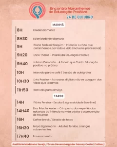 Entre os palestrantes convidados está a especialista em Educação Positiva, Maya Eigenmann, que pela primeira vez estará participando de evento no Maranhão. Ela vai falar sobre “Adultos feridos, crianças sobreviventes”, no dia 24, às 16h20. Maya Eigenmann é a fundadora da Escola da Fundação Positiva, a única Escola formadora na abordagem do tema, chancelada pelo MEC e Anhanguera.